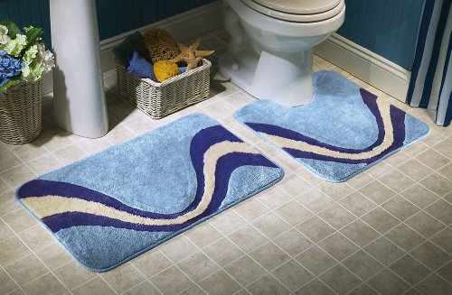 Reminiscent of the ocean's waves, these graphic rugs add a fun touch to your bathroom floor. Plush nylon with non-skid back. Machine wash. Imported. 22" x 22" contour rug and 20" x 32" mat....